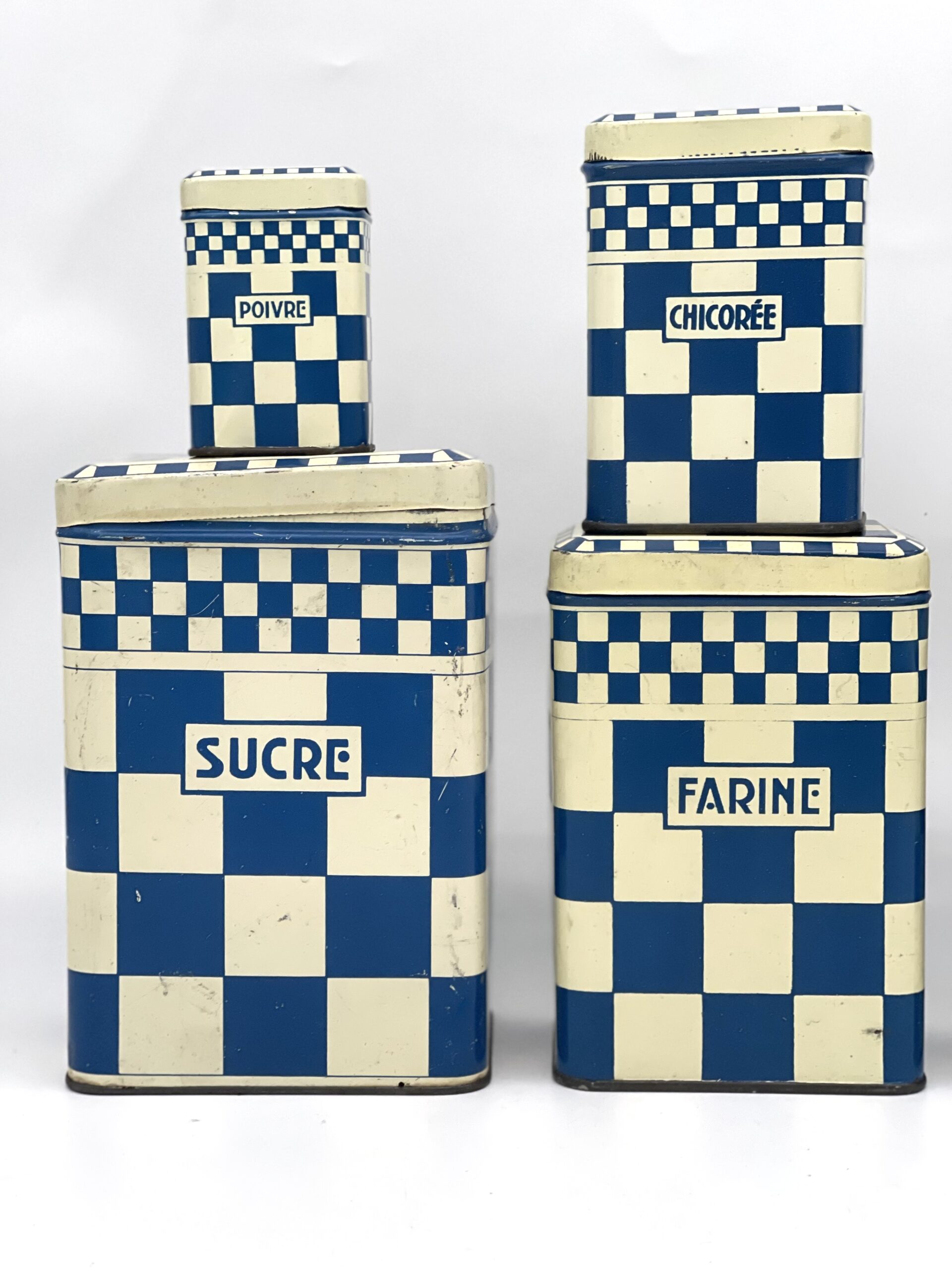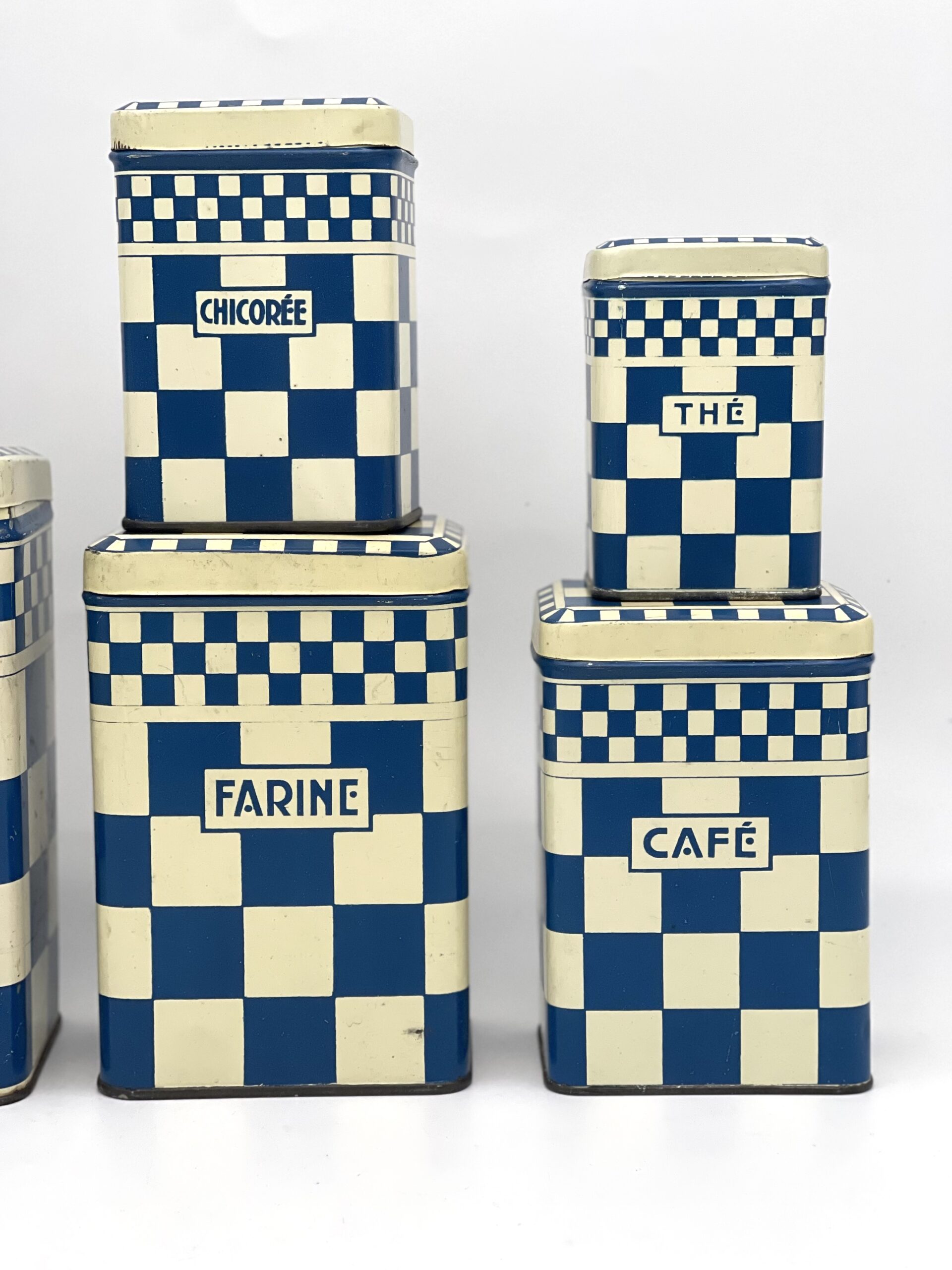 Lot de 6 boites anciennes en métal décor damier bleu Lustucru